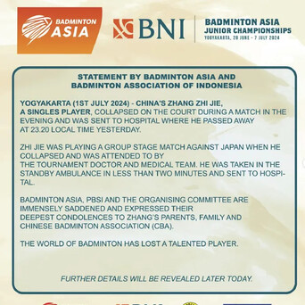事后,亚洲羽毛球协会及印尼羽毛球协会发出声明,称张志杰在当地时间6月30日23时20分于医院中去世。
